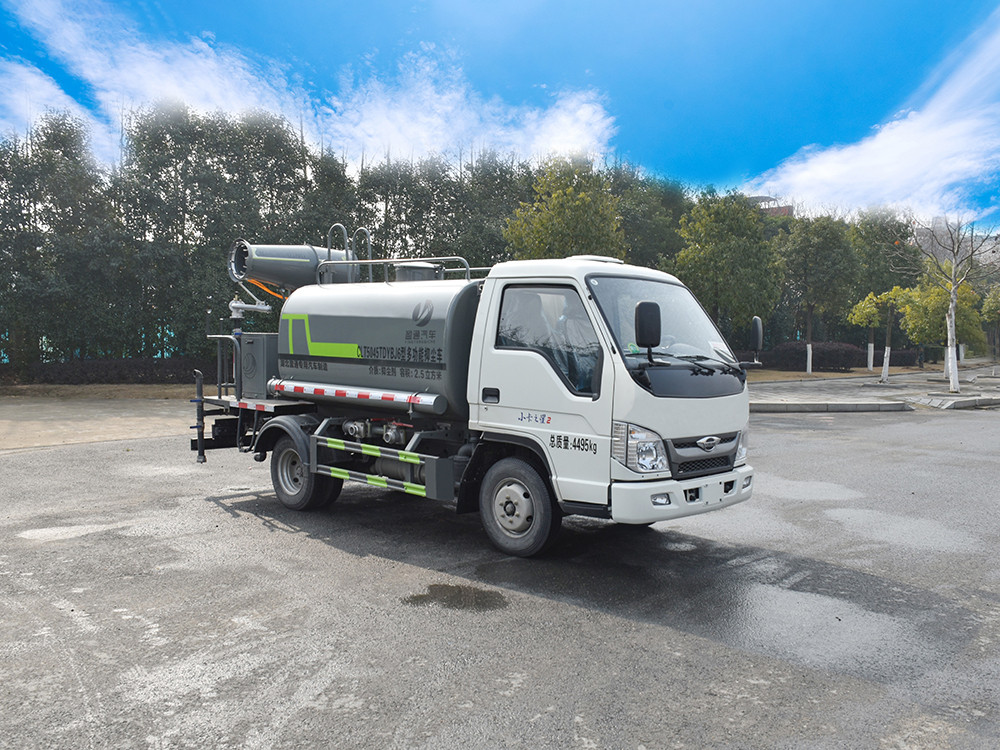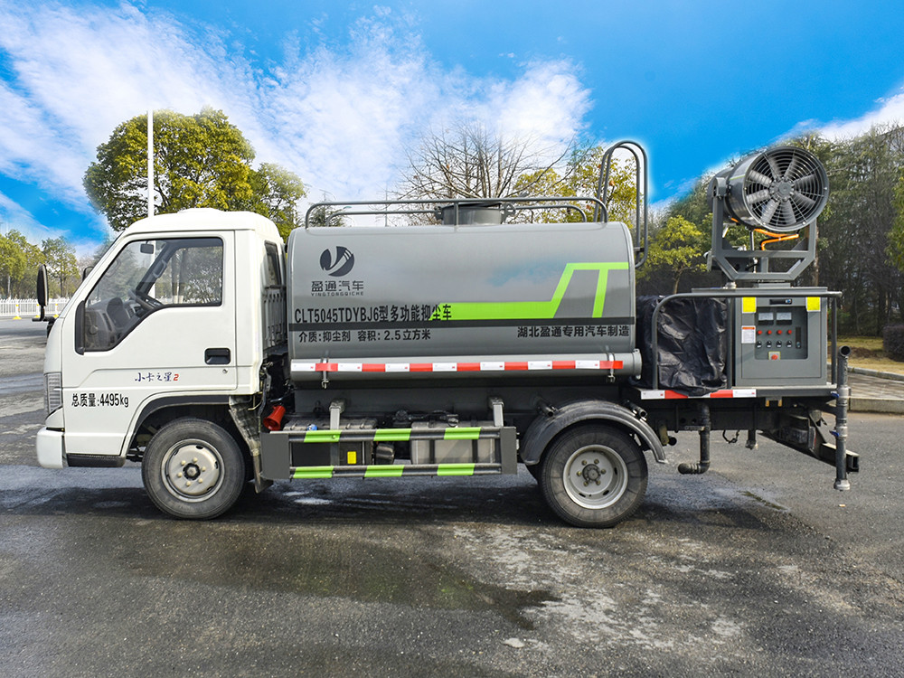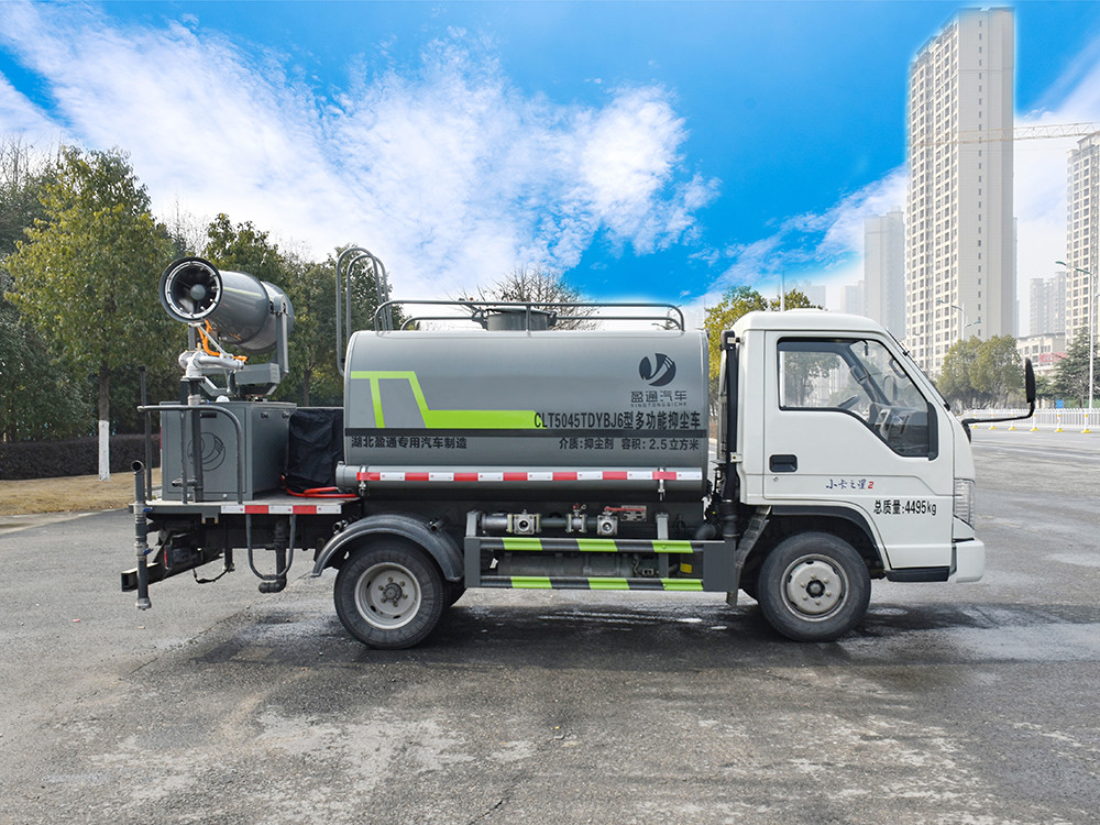 3方霧炮灑水車 整車型號 CLT5045TDYBJ6 型多功能抑塵車 2 發動機型號 Q23-95C60 3 發動機馬力/功率 全柴 95 馬力/70KW 4 發動機排量 2300ML 5 變速箱 蒙沃 5 檔箱 6 輪胎規格 6.00 鋼絲胎 7 軸距 2600 8 總質量 4495KG 9 整備質量 2700KG 10 額定載質量 1665KG 11 整車尺寸(長×寬×高) 5.365*1.9*2.6 12 罐體容積 2.7 方 13 燃料種類 柴油 14 排放標準 國六 15 水泵型號 40/50 16 罐體材質 Q235 碳鋼產品功能展示 霧炮 后灑 后對沖 高炮 側噴