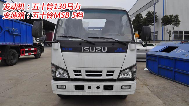 五十鈴擺臂式垃圾車,慶鈴五十鈴底盤,600P駕駛室,五十鈴130馬力發(fā)動機,五十鈴MSB5檔變速箱,帶空調(diào),動力轉(zhuǎn)向,前橋2.5噸,后橋4.8噸,帶ABS,7.00R16鋼絲胎,雙回路式油剎,單排可反轉(zhuǎn)。
