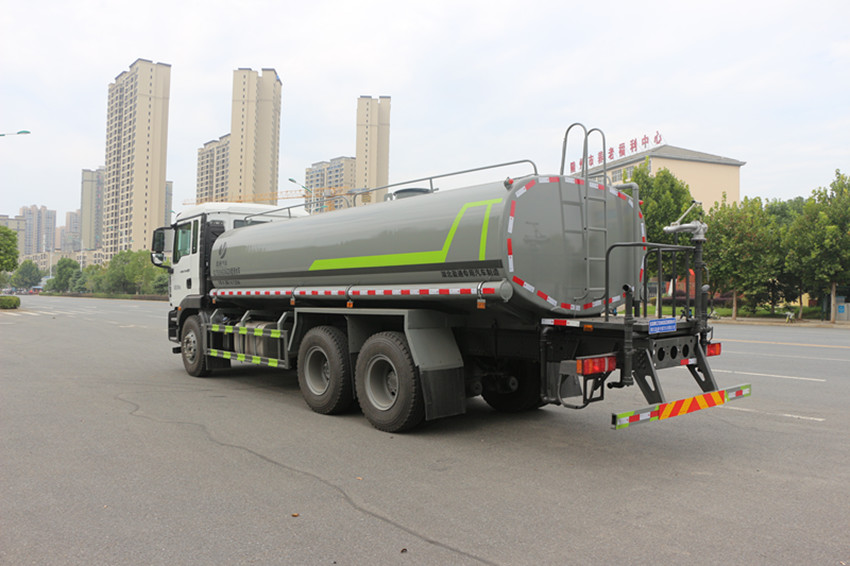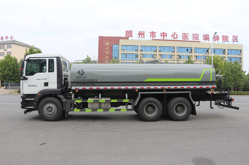 北京密云區灑水車產品主要技術參數 序號 名稱 型號、規格 1 整車型號 CLT5255GSSZZ6 型灑水車 2 發動機型號 MC07.31-60 3 發動機馬力/功率 德國曼 310 馬力/228KW 4 發動機排量 6870ML 5 變速箱 豪沃 9 檔 6 輪胎規格 11.00 鋼絲胎 7 軸距 4350+1350 8 總質量 25000KG 9 整備質量 10800KG 10 額定載質量 14005KG 11 整車尺寸(長×寬×高) 9.85*2.5*3.2 12 罐體容積 18.3 方 13 燃料種類 柴油 14 排放標準 國六 15 水泵型號 60/90 16 罐體材質 Q235 碳鋼