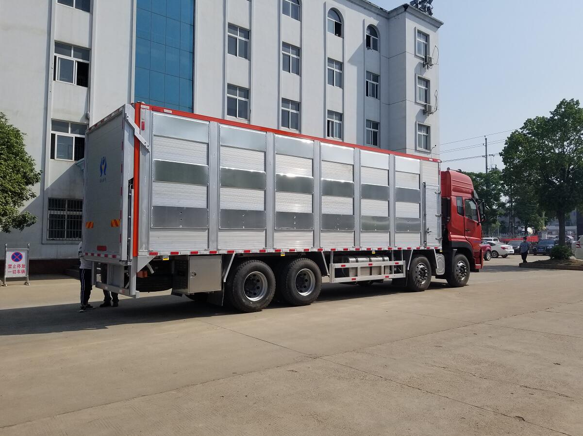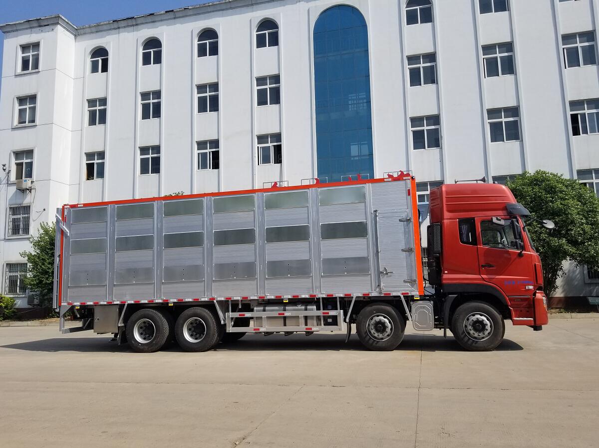 東風天龍前四后八全鋁合金運輸車,又稱鋁合金禽畜運輸車,可做三層或四層,品質(zhì)更佳,車身結(jié)構(gòu)采用鋁合金打造,不銹鋼噴頭和飲水頭,相比鋼制車體,重量減輕20%-30%,可以裝載更多的畜禽,空車行駛節(jié)約燃料,低維保費用,不生銹,生命周期無線延長,無需漆面保護,清潔簡單便捷,操作簡易,車廂升降平臺由全液壓控制,遙控操作更加簡便,自動恒溫系統(tǒng),車廂設(shè)計合理方便控制家禽上下車,遙控升降車,動物福利,更大的 內(nèi)部空間,家禽在車廂內(nèi)更感舒適,溫度控制系統(tǒng),沖淋飲水系統(tǒng),遙控側(cè)面通風系統(tǒng),可開合側(cè)窗系統(tǒng),強制通風系統(tǒng)。