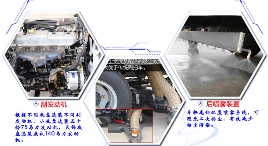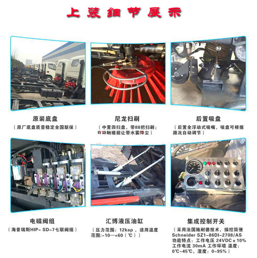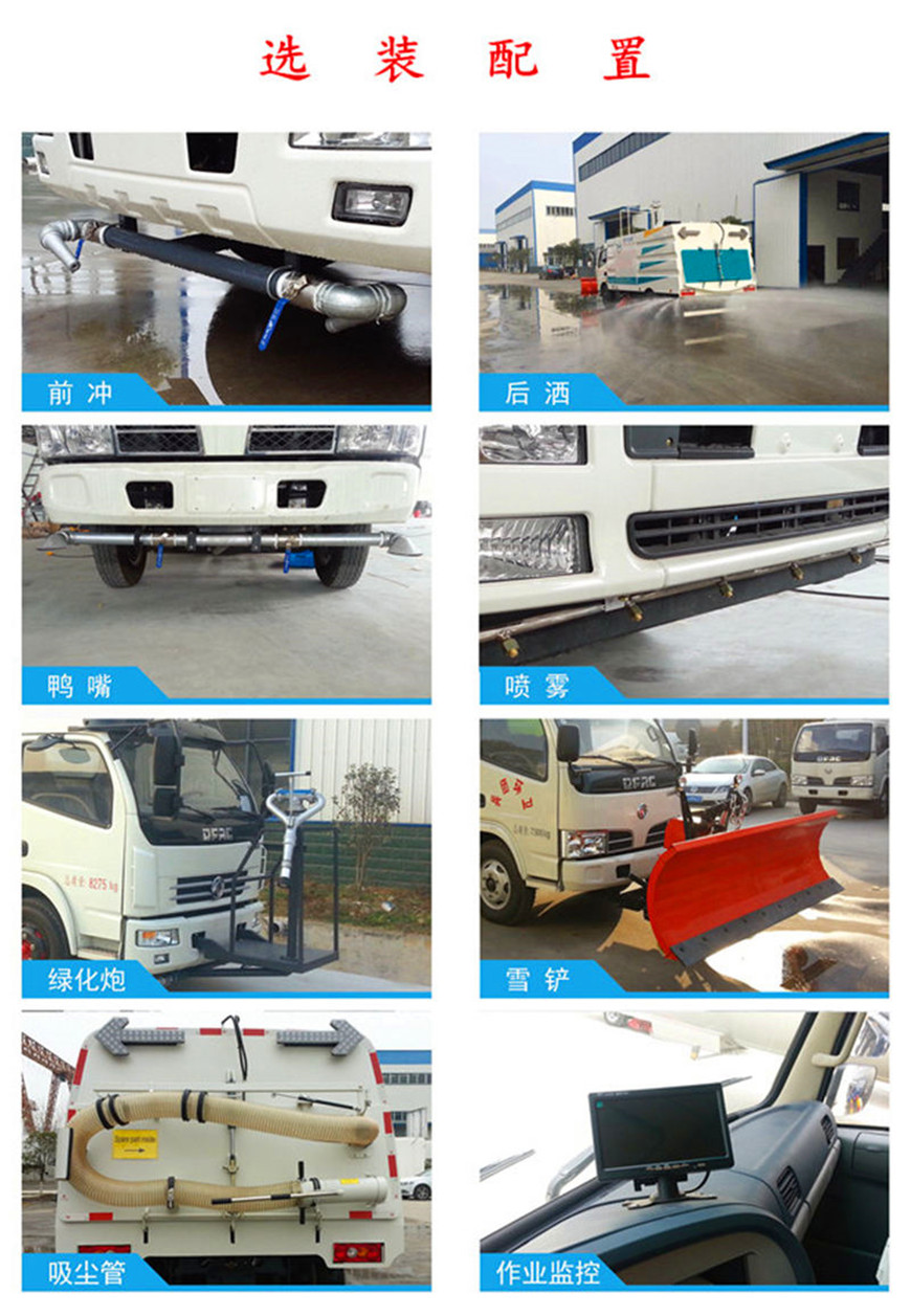 東風(fēng)8方洗掃車采用東風(fēng)型國(guó)五二類底盤改裝,加裝副發(fā)動(dòng)機(jī)、風(fēng)機(jī)、高壓水泵、清水箱、垃圾箱、左右立掃、帶噴水桿的寬吸嘴、低壓沖洗系統(tǒng)、垃圾箱自潔,掃盤降塵系統(tǒng),液壓系統(tǒng)、專用裝置電控系統(tǒng)和副車架等改裝而成: