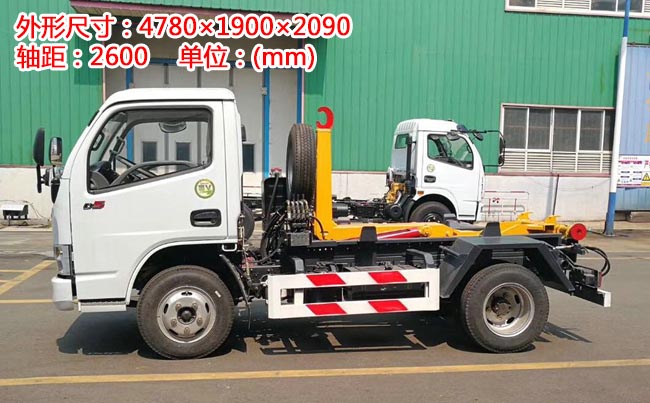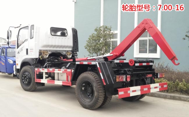 配套5~6立方米勾臂垃圾箱,高強度主勾臂,雙液壓油缸,采用國產(chǎn)油泵、多路閥、油缸,駕駛室外操作,尾部帶滾輪,箱體鎖緊裝置,鎖緊后可實現(xiàn)垃圾車自卸。