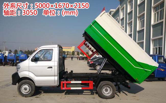 重汽王牌掛桶式垃圾車,1650單排駕駛室,綿陽112馬力汽油發動機,5檔變速箱,185R14LT輪胎型號,140大梁,3噸后橋、油剎。