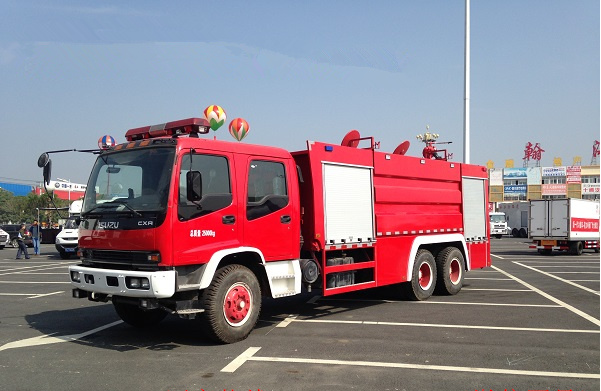 五十鈴11-12噸雙橋消防車采用慶鈴QL1250WPFZY底盤改裝,平頭雙排駕駛室,五十鈴6HK1-TCH發動機,300馬力,罐體容積11-12立方米(水罐容積8立方米,泡沫罐容積3立方米);整車結構緊湊,方便靈活,動力性能好,車速高,能自由進出鄉村狹窄道路及小區,具有大型消防車的全套消防功能,上裝箱體的上裝骨架全部采用引進歐洲技術生產的鋁合金型材制造,整車的重量減少,機動性能和整車載重量提高。除了裝備消防水泵及器材以外,還設有較大容量的貯水罐及水槍、水炮等。可將水和消防人員輸送至火場獨立進行撲救火災。也可以從水源吸水直接進行撲救,或向其他消防車和滅火噴射裝置供水。在缺水地區也可作供水、輸水用車,主要適用于大中城鎮、鄉村狹窄街道、城市小區、繁忙的批發市場等場所的一般物質滅火,閑暇時可用于園林噴灌、道路清灑。