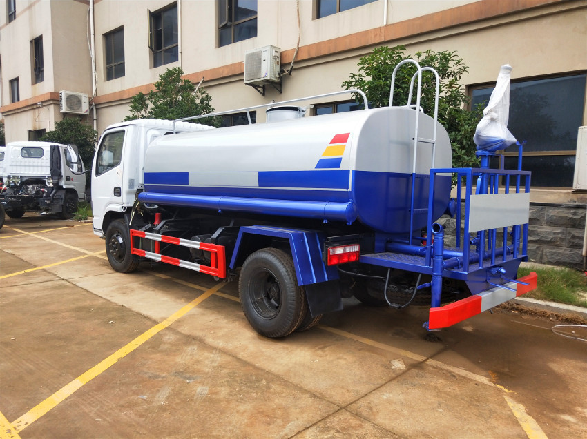 罐體容積:5立方米,鋼板為4mm碳鋼Q235材質專用容積版制作,罐內隔板具有防波作用,以減輕汽車行駛時罐體液體沖擊;配大功率專用灑水泵,泵可自吸自排;前封頭帶水位計,后平臺主管路帶1寸澆花接口,后爬梯,帶1個消防接頭,帶1個自流閥,1個過濾裝置。