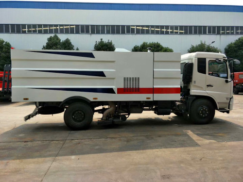 該掃路車采用東風天錦型國五二類底盤改裝,加裝副發動機、風機、清水箱、垃圾箱、左右立掃、后置吸盤,掃盤降塵系統,液壓系統、專用裝置電控系統和副車架等改裝而成(可加裝前沖后灑,可以根據客戶要求做成方形、圓形箱